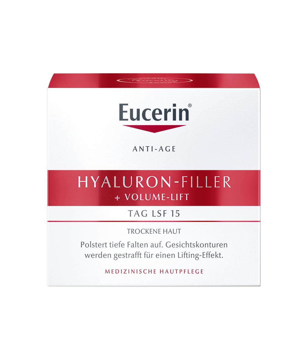 Eucerin VOLUME-FILLER Tagespflege für trockene Haut mit drei aktiven Inhaltsstoffen wurde speziell auf die Bedürfnisse trockener Haut mit Volumen- oder Konturverlust abgestimmt.
