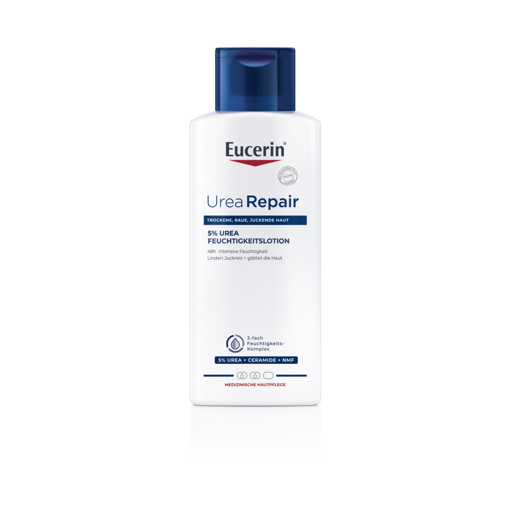 Die Eucerin UreaRepair PLUS Lotion 5% enthält den einzigartigen, hautverwandten Repair-PLUS-Komplex: Urea und weitere natürliche Feuchthaltefaktoren (Natural Moisturing Factor = NMF) spenden und binden intensiv Feuchtigkeit und sorgen so für einen gesunden Feuchtigkeitsgehalt der Haut. Zusätzlich stärken Ceramide die physiologische Hautbarriere, damit die Feuchtigkeit nicht entweichen kann.